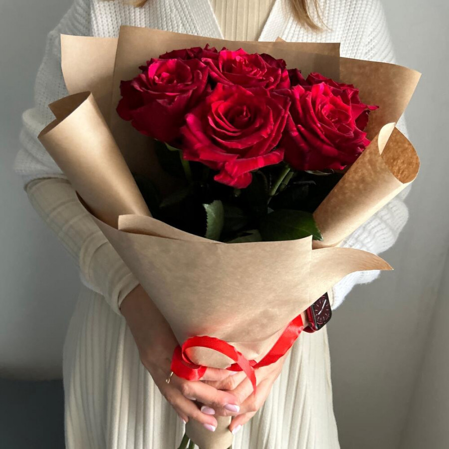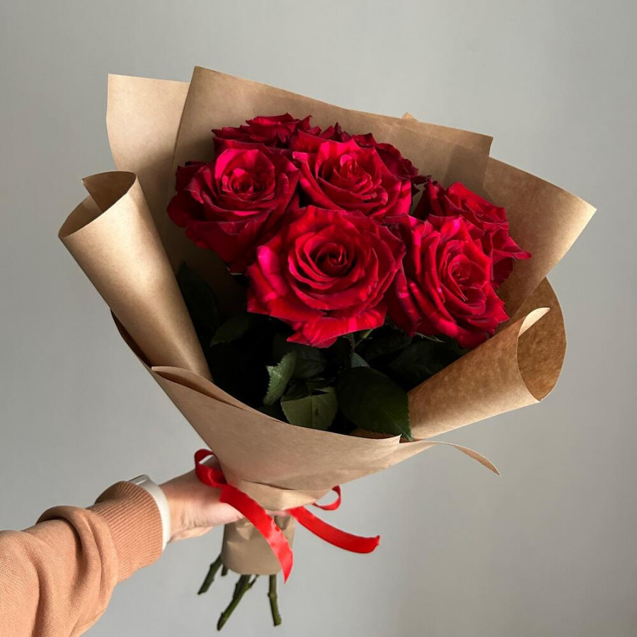 На фото букет из 7 красных роз. В составе: роза 7 шт, крафт-бумага 1 шт, атласная лента 1 шт, . Все цветы свежие и ароматные, букет красиво оформлен и отлично подходит для подарка. Доступна доставка цветов или самовывоз.